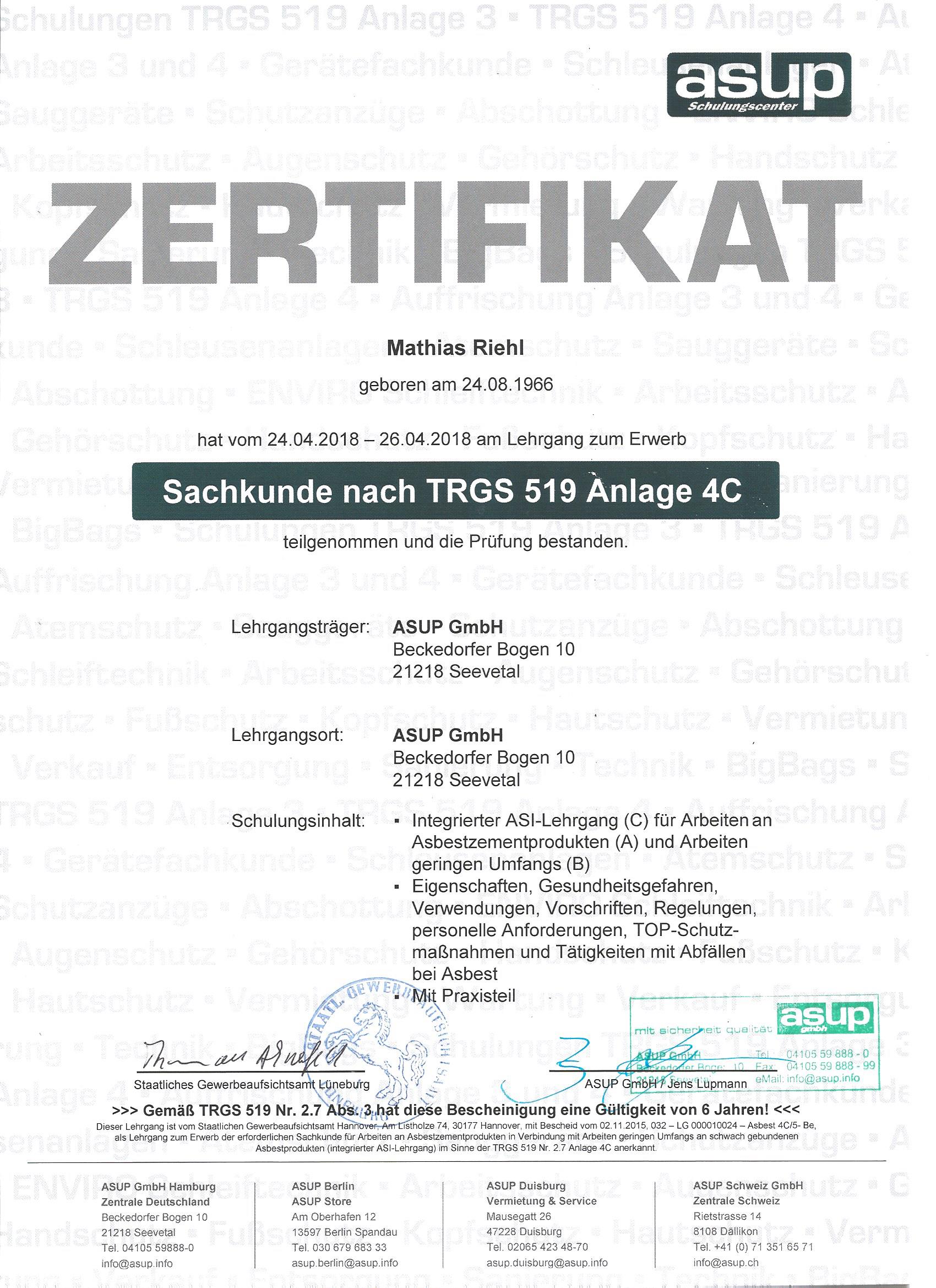 Zertifizierung nach asup - Sachkunde nach TRGS 519 Anlage 4C |